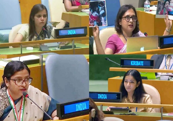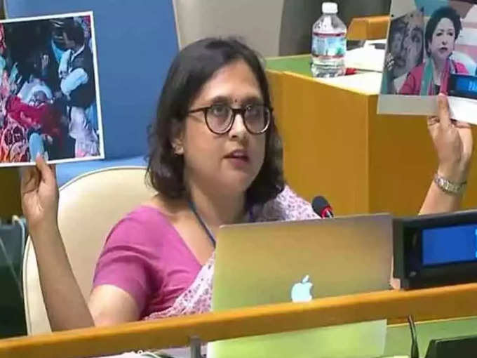 ഇന്ത്യന് നയതന്ത്രജ്ഞ പൗലോമി ത്രിപാഠി യഥാര്ത്ഥ ചിത്രങ്ങള് ഉയര്ത്തിക്കാട്ടി പാകിസ്ഥാനെ നാണം കെടുത്തി. ഒരു കൈയില് ഇന്ത്യന്സൈനിക ഉദ്യോഗസ്ഥനായ ധീരബലിദാനി ഉമര് ഫയാസിന്റെ ചിത്രവും മറുകൈയില് പാക് പ്രതിനിധി മലീഹ ലോധിയുടെ ചിത്രവും ത്രിപാഠി ഉയര്ത്തിപ്പിടിച്ചു. ഉമര് ഫയാസ് പാക്ക് സ്പോണ്സേര്ഡ് ഭീകരതയുടെ ഇരയാണെന്നും ലോധി നുണയനായ വേട്ടക്കാരനാണെന്നും പൗലോമി അന്ന് തുറന്നടിച്ചു.