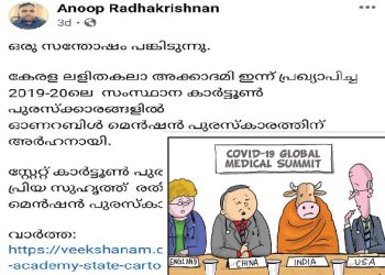 തൃശ്ശൂര് : രാജ്യത്തെ അപമാനിക്കുന്ന കാര്ട്ടൂണിന് പുരസ്കാരം നല്കി കേരള ലളിതകലാ അക്കാദമി. സംസ്ഥാന തല കാര്ട്ടൂണ് മത്സരത്തില് ജൂറിയുടെ പ്രത്യേക പരാമര്ശം നേടിയ കോവിഡ് ഗ്ളോബല്...