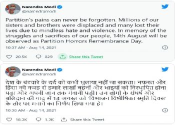 New Delhi: Prime Minister, Narendra Modi has said that in memory of the struggles and sacrifices of our people, 14th August...