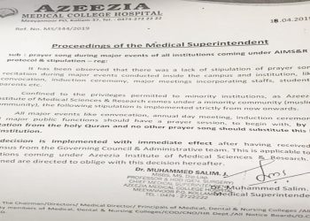 A private educational institution run by a Muslim management, Azeezia Medical College Hospital in Kollam, Kerala, has issued a Shariah-compliant...