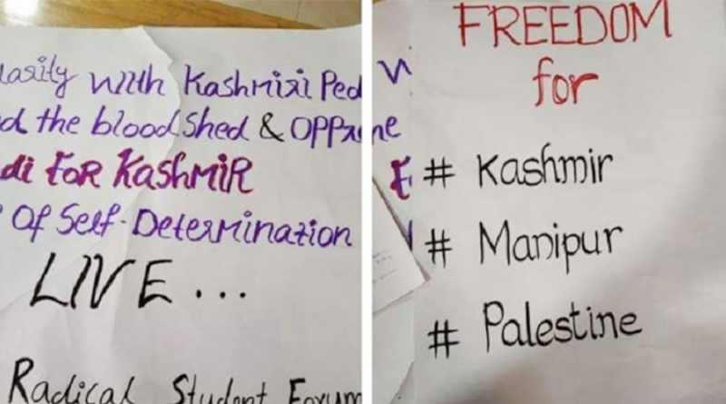 Both of them are active workers of the Radical Students Forum (RSF), an Islamist fringe group. The anti-India posters, expressing solidarity with separatists, also voiced for ‘self-determination’ rights of ‘Kashmiris’ and ending ‘bloodshed and oppression’. The culprits were arrested following a complaint by the principal of the college.