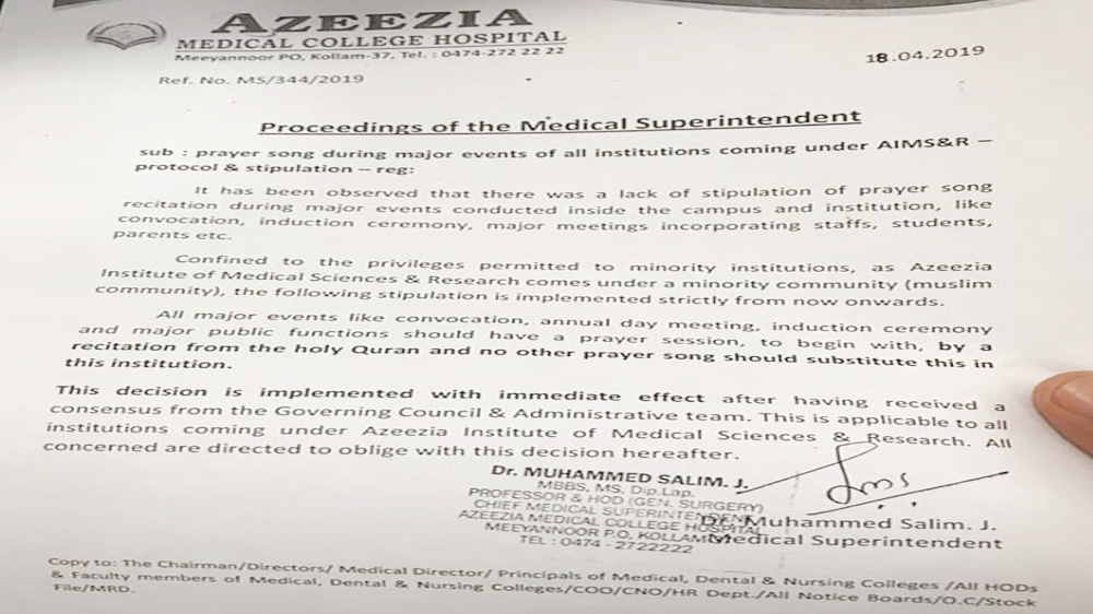 A private educational institution run by a Muslim management, Azeezia Medical College Hospital in Kollam, Kerala, has issued a Shariah-compliant circular stating that there should be recitation of only Quran and “no other prayer song should substitute this” during all events on the campus.