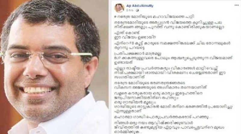 In a Facebook post last week, A P Abdullakutty had said Prime Minister Modi got a spectacular victory for the second time because he inculcated Gandhian values in governance.