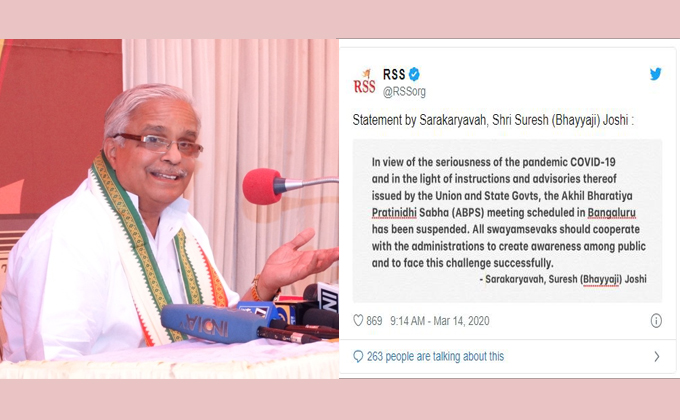 The annual Akhil Bhartiya Pratinidhi Sabha (ABPS) of RSS that was to be held from 15th in Bengaluru has been called off. RSS Sarkaryavaha Suresh Bhaiyyaji Joshi in a statement issued to the media said that in view of the seriousness of the pandemic COVID19 and in light of the instructions and advisories issued by the Union and State governments, the ABPS has been suspended. Bhaiyyaji Joshi also appealed all Swayamsevals to join the efforts to create awareness among the public and to face the challenge successfully.