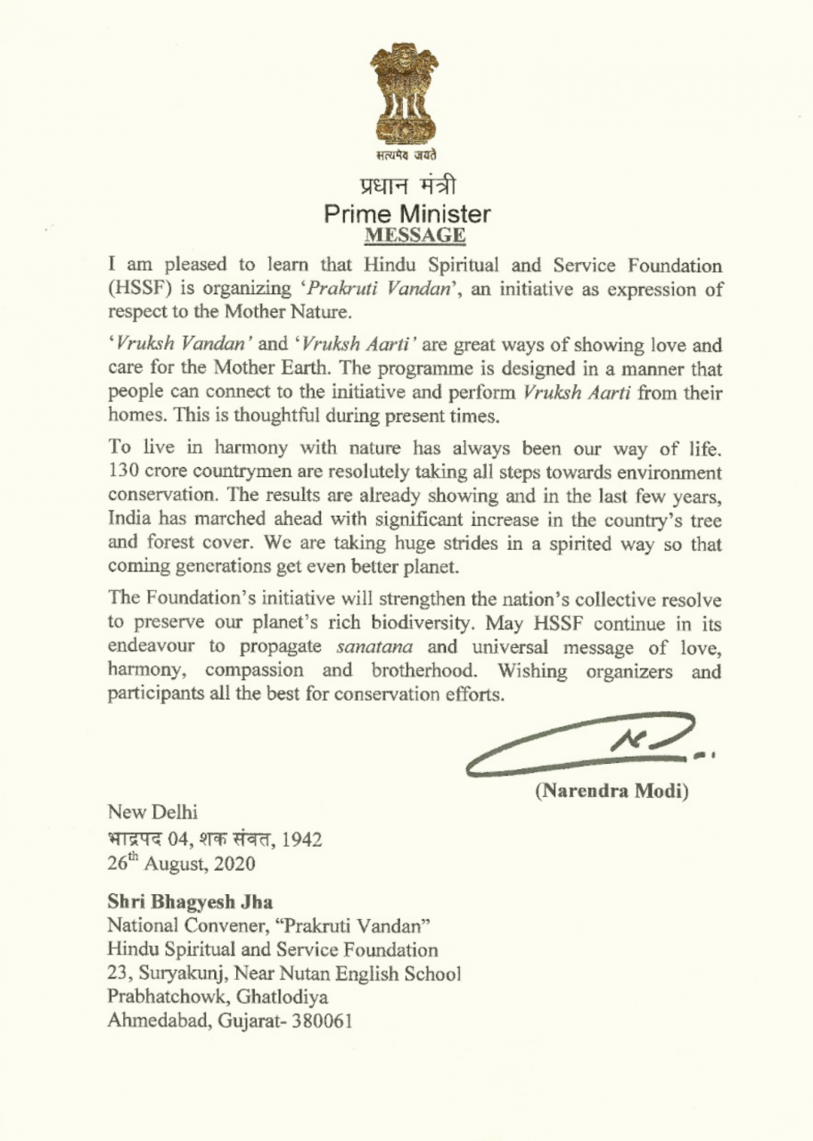 “Preservation environment is core value of our culture” PM Narendra Modi lauds the efforts of 130 core Indian. In a message for success of nationwide campaign by Hindu Spiritual and Service Foundation, Modi appreciated foundation’s well thought initiative to create awareness amongst the masses for sustainable development and protecting our biodiversity in this difficult times. A Message by HONOURABLE PM NARENDRA MODI to appreciate, applaud and inspire Hindu Spiritual and Service Foundation [HSSF] and Initiative For Moral and Cultural Training Foundation [IMCTF] for jointly organizing – Prakriti Vandan. in Association with Paryavaran Sanrakshan Gathividhi a Wing of RSS to imbibe reverence towards the Nature‟s creation, in more than 500 centers in the country and Globally more than 25 countries on 30th August 2020 from 10.00am to 11am. We are expecting more than 1 crore fellow citizens to join this unique one of its kind program. It is going to be virtual program of participation from their respective home. This initiative is to create reverence towards Mother Nature and Mother Earth. Honourable Prime Minister, wishes that HSSF continues its endeavor to propagate “SANATAN” and Universal values to spread the message of love, harmony, compassion and brotherhood.