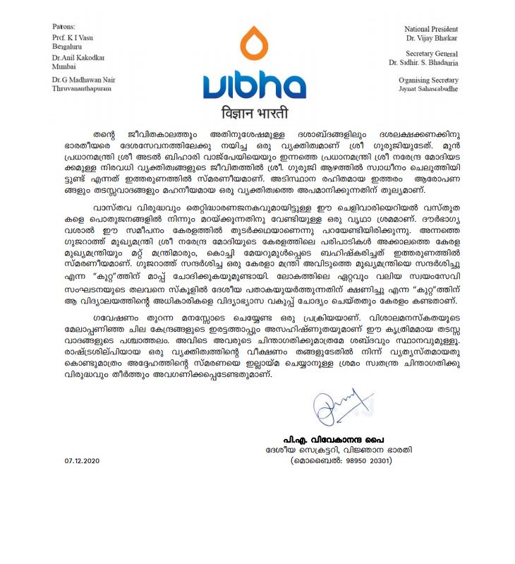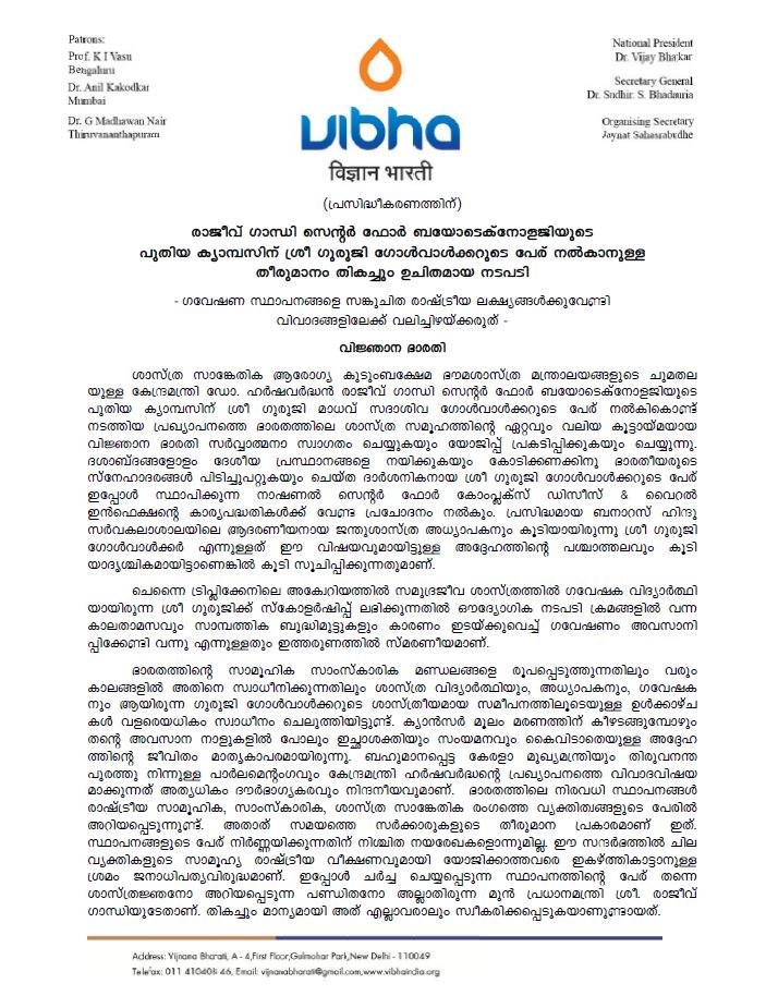 New Delhi. Vijnana Bharati, the largest voluntary platform of Scientists and Technocrats in India wholeheartedly welcomes and endorses the decision announced by Dr. Harshvardhan, Union Minister for Science & Technology, Health & Family Welfare and Earth Sciences to name the new campus of Rajiv Gandhi Centre for Biotechnology (RGCB), Thiruvananthapuram after Sri Guruji (Madhav Sadashiv Golwalkar). As a visionary who led and inspired a nationalist movement for decades and is being fondly remembered and respected by crores of Indians, name of Sri Guruji is sure to inspire the activities of the proposed National Centre for Complex Disease in Cancer and Viral Infection. As a respected faculty of Zoology in the prestigious Banaras Hindu University during the early thirties, this incidentally has a connect with his subject too. It is also worth remembering that Sri Guruji had to leave his research in Marine Biology at Chennai aquarium, Triplicane, due to bureaucratic delays in approval of scholarship amid financial difficulties. The deep insights of Sri Guruji, with a scientific approach, being a student, teacher and researcher of science, to socio cultural dimensions of our nation have played a key role in shaping the foundations of our nation today and the times to come. Even when he lost his life to cancer, his will power and approach to life during his last days were most composed and exemplary. This aspect of Sri Guruji’s life can be soothing and worth emulating to the large number of cancer patients, for whom this campus is being established.