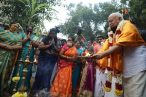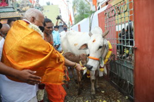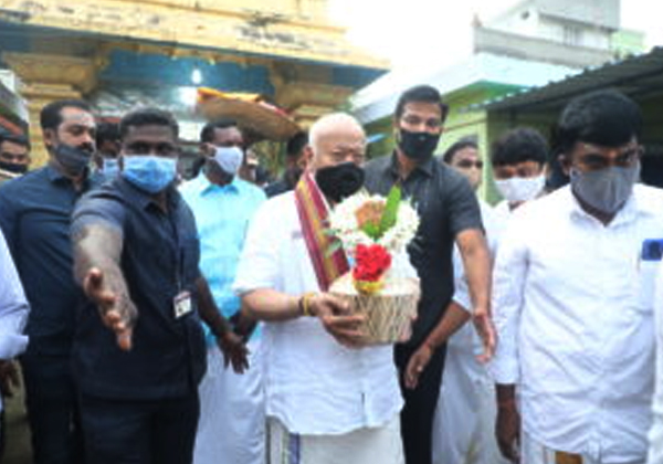 Chennai : RSS Chief Shri Mohan Bhagawat participated in the Pongal festival at Shri Navasakthi Kadumbadi Chinnamman Temple by public belonging to Ponniamman Nagar, Moolakadai with religious fervour and gaiety. He accepted Poorna Kumbha respect and took part in the temple pooja.  Following which, he took part in Gow Mata pooja and offered pongal pot to Surya Bhagwan.  He witnessed the traditional games by children and Uriyadi by elders subsequently.