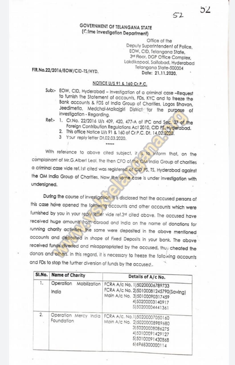As per a post made on the Facebook page named “OM Justice Seekers”, the Crime Investigation Department, in their notice vide notice no. U/S 91 & 160 Cr. P.C, stated that during the course of an earlier ongoing investigation, the CID Police found that the accused persons have received huge amounts from abroad in the name of donations for running their charity activities, which are deposited into FDs. In order to stop this misappropriation of funds and other further diversion, the CID Police has frozen the 26 bank accounts of eight FCRA-registered Christian Organizations, including OM India.