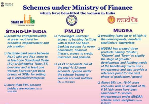 New Delhi: Ministry of Finance, in the past seven years has launched various Schemes which have special provisions for empowerment of women. These Schemes have financially empowered women to lead a better life and chase their dreams of being an entrepreneur.