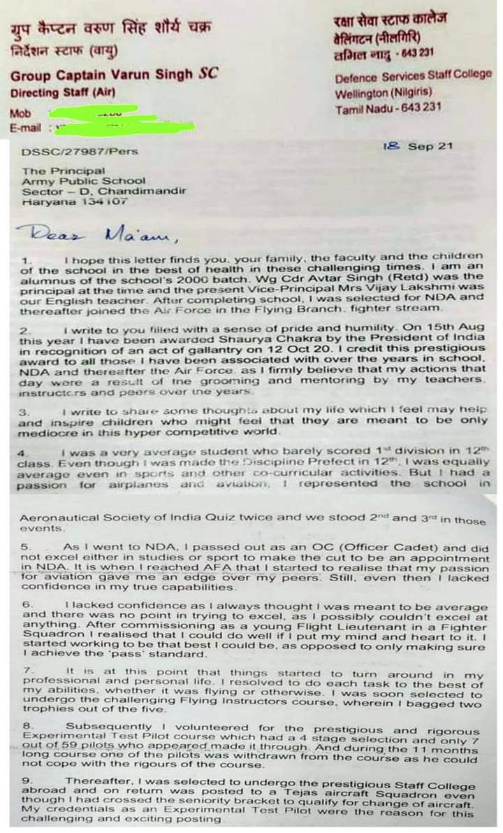 In his letter, Varun Singh did not boast his valour, instead he referred to his failures and talked about how he converted his shortcomings into abilities.