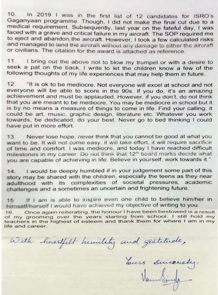 Varun Singh, in his letter, also encouraged students and said that ‘believe in youself and work for it’.
