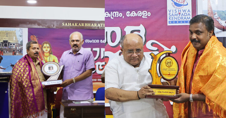 K.R. Umakanthan presented the first M.P. Manmadhan Puraskar to Mathrubhumi senior reporter T.J. Sreejith.