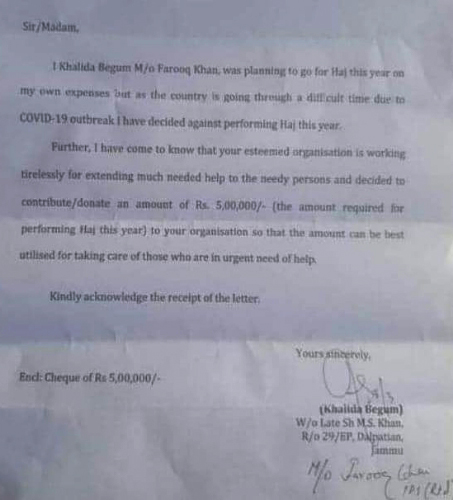 In a letter addressed to Sewa Bharati, Khalida Begum writes that she was planning to go for Haj this year on her own expenses but as the country is going through the difficult time due to COVID-19 outbreak she decided against performing Haj this year.