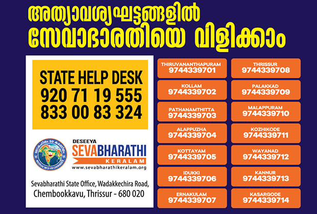 Seva Bharathi came to the rescue in Kerala with the onset of rains again. A special war room has been set up at the State Office in Thrissur to coordinate disaster and relief activities. Seva Bharati has set up special control rooms in all districts, officials said.