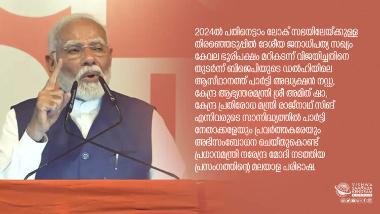 സുഹൃത്തുക്കളെ, നമുക്ക് മുന്നിൽ ഒരു വലിയ ലക്ഷ്യമുണ്ട്, വികസിത ഭാരതം എന്ന ലക്ഷ്യം. പത്തു വർഷങ്ങൾക്കു ശേഷവും തുടർച്ചയായ മൂന്നാം വട്ടവും ജന ങ്ങൾ നമ്മളിൽ അർപ്പിച്ച വിശ്വാസവും സ്നേഹവും നമ്മുടെ ആത്മവിശ്വാസം വർദ്ധിപ്പിക്കുന്നതാണ്. നമ്മുടെ ലക്ഷ്യത്തെ കൂടുതൽ ശക്തിപ്പെടുത്തുന്നതാണ്. പുതിയ ഊർജ്ജം പകരുന്നതാണ്. നമ്മുടെ വിരോധികൾ ഒറ്റക്കെട്ടായി ഈ ലോക്സഭ തിരഞ്ഞെടുപ്പിനെ നേരിട്ടിട്ടും ഈ തിരഞ്ഞെടുപ്പിൽ ബിജെപി ഒറ്റയ്ക്ക് നേടിയ അത്രയും സീറ്റുകൾ പോലും അവർക്ക് നേടാൻ ആയില്ല. രാജ്യത്തെ ബിജെപി പ്രവർത്തകരോടും ജനങ്ങളോടും എനിക്ക് പറയാനുള്ളത് നിങ്ങൾ ഈ കടുത്ത വേനലിലും നടത്തിയ പ്രയന്തം, ഒഴുക്കിയ വിയർപ്പ് നിരന്തമായി പ്രവർത്തിക്കാനുള്ള ഊർജ്ജം എനിക്ക് നൽകുന്നതാണ് എന്നാണ്. നിങ്ങൾ പത്തു മണിക്കൂർ ജോലി ചെയ്യാൻ തയ്യാറായാൽ ഞാൻ പതിനെട്ടു മണിക്കൂർ ജോലിചെയ്യാൻ തയ്യാറാണ്, നിങ്ങൾ രണ്ട് ചുവട് നടക്കാൻ തയ്യാറാണെങ്കിൽ ഞാൻ നാല് ചുവടുകൾ നടക്കാൻ തയ്യാറാണ് അതാണ് എനിക്ക് നിങ്ങളോട് വീണ്ടും വീണ്ടും പറയാനുള്ളത്. നമ്മൾ ഭാരതീയർ ഒത്തൊരുമിച്ച് പ്രയത്നിക്കും, രാജ്യത്തെ മുന്നോട്ട് നയിക്കും. മൂന്നാമത്തെ ഈ അവസരത്തിലും രാജ്യം വലിയ തീരുമാനങ്ങളുടെ പുതിയ ചരിത്രം കുറിക്കും. ഇത് മോദി നിങ്ങൾക്ക് നൽകുന്ന ഉറപ്പാണ്.