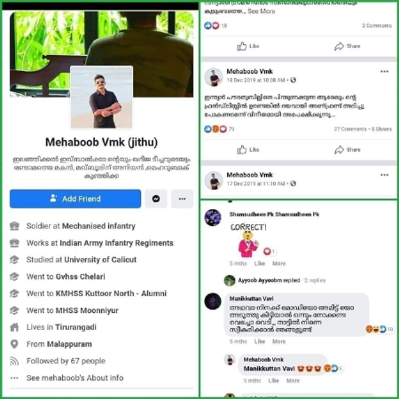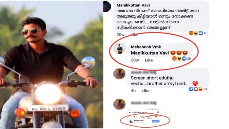 പൗരത്വ ഭേഗഗതി നിയമത്തിനെതിരേ കലാപം അഴിച്ചുവിട്ട സമയത്താണ് ഫേസ്ബുക്കില് മെഹബൂബിന്റെ പോസ്റ്റിനു താഴെ മണിക്കുട്ടന് വാവി എന്ന ഒരു അക്കൗണ്ടില് നിന്ന് ‘അഥവാ നിനക്ക് മോദിയോ അമിത് ഷായേയോ അടുത്ത കിട്ടിയാല് ഒന്നും നോക്കേണ്ട, വെച്ചോ വെടി… നാട്ടിന് നിന്നെ സ്വീകരിക്കാന് ഞങ്ങളുണ്ട്’ എന്ന് കമന്റ് ചെയ്തത്. ഇതിനെ സ്നേഹം സൂചിപ്പിക്കുന്ന കമന്റുമായാണ് മെഹബൂബ് പിന്തുണച്ചത്. ഇതിനെതിരേ സോഷ്യല് മീഡിയിയല് പ്രതിഷേധം ഉയര്ന്നിരുന്നു. സൈനികനായ ഒരാളില് നിന്ന് ഇത്തരത്തില് അതിരൂക്ഷമായ രാജ്യദ്രോഹം പരാമര്ശം ഉണ്ടാകുന്നതിനെ ഗൗരവമായി കാണണമെന്ന് പലരും കമന്റ് ചെയ്തു. പ്രധാനമന്ത്രിയും ആഭ്യന്തരമന്ത്രിയും പല അവസരങ്ങളിലും സാധാരണ സൈനികര്ക്കൊപ്പം അടുത്ത് ഇടപെഴകാറുണ്ട്. അതിനാല് ഇരുവരേയും വധിക്കാന് പിന്തുണ അര്പ്പിച്ച ഒരു ഒരാള് സൈന്യത്തില് തുടരുന്നത് അതീവ ഗുരുതരമാണെന്ന് പലരും സോഷ്യല് മീഡിയ വഴി പരാതി നല്കി. ഇതു സംബന്ധിച്ച് ചിലര് സൈനിക വൃത്തങ്ങളില് പരാതിയും നല്കി. ഫേസ്ബുക്ക് പ്രൊഫൈല് പ്രകാരം ഇയാള് ഇന്ത്യന് ആര്മി ഇന്ഫന്ററി റെജിമന്റില് ജോലി ചെയ്യുന്നു എന്നാണ് വ്യക്തമാക്കുന്നത്. തുടര്ന്ന് മിലറ്ററി ഇന്റലിജന്സ് കൂടി നടത്തിയ അന്വേഷണത്തിലാണ് മുന്പും ഇയാള് സോഷ്യല്മീഡിയ വഴി രാജ്യവിരുദ്ധ പരാമര്ശങ്ങള് സ്ഥിരമായി നടത്തുന്നുണ്ടെന്ന തെളിഞ്ഞത്. തുടര്ന്നാണ് അറസ്റ്റ് ചെയ്തത്. അഭിപ്രായ സ്വാതന്ത്ര്യത്തെ തുടര്ച്ചായി ഒരു വിഭാഗം പൗരന്മാര് ദുര്വിനിയോഗം ചെയ്യുന്നകാര്യം കാലങ്ങളായി റിപ്പോര്ട്ട് ചെയ്യപ്പെടുന്നുണ്ട്.