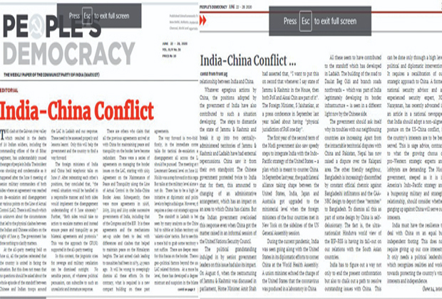 സിപിഎം മുന് ജനറല് സെക്രട്ടറിയും പോളിറ്റ് ബ്യൂറോ അംഗവുമായ പ്രകാശ് കാരാട്ടാണ് മാസികയുടെ എഡിറ്റര്. ”ചൈന ഇന്ത്യയുടെ അതിര്ത്തി അല്പ്പാല്പ്പമായി പിടിച്ചെടുക്കുന്നതിനാലാണ് സംഘര്ഷമെന്ന വിലയിരുത്തല് ശരിയല്ല. അതിര്ത്തി സംഘര്ഷത്തിന് ആഴത്തിലുള്ള കാരണങ്ങളുണ്ട്. കേന്ദ്രം സ്വീകരിച്ച സമീപനം ഒരു ഘടകമാണ്. ജമ്മു കശ്മീരിനെ വിഭജിച്ച നടപടി ചൈന അവകാശപ്പെടുന്ന സ്ഥലത്തിനും ബാധകമാണ്. ഇതിനെതിരെ രണ്ട് തവണ ചൈന പ്രതിഷേധമറിയിക്കുകയും ഐക്യരാഷ്ട്രസഭയുടെ സുരക്ഷ കൗണ്സിലിന്റെ അനൗദ്യോഗിക യോഗത്തില് ഉന്നയിക്കുകയും ചെയ്തു. പാക് അധിനിവേശ കശ്മീരും അക്സായ് ചിന്നും ഇന്ത്യയുടെ ഭാഗമാണെന്ന ആഭ്യന്തര മന്ത്രി അമിത് ഷായുടെയും പിഒകെ ഭാവിയില് ഇന്ത്യയോട് ചേരുമെന്ന വിദേശകാര്യ മന്ത്രി എസ്. ജയശങ്കറിന്റെയും പ്രസ്താവനകള് പ്രത്യാഘാതമുണ്ടാക്കി”. മുഖപ്രസംഗം പറയുന്നു.