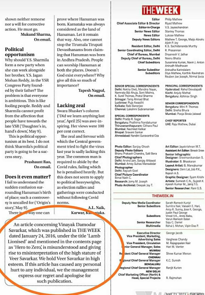 The apology read, We hold Veer Savarkar in high esteem. If this article has caused any personal hurt to any individual, we the management express our regret and apologise for such publication.”