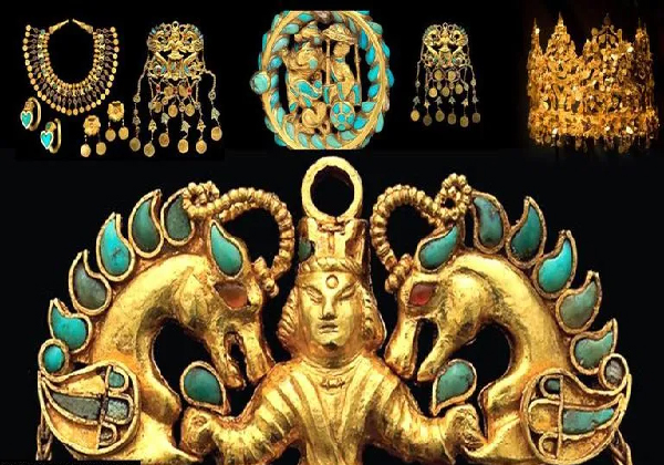 വടക്കന് അഫ്ഗാനിസ്ഥാനിലെ ഷെര്ബര്ഗാന് ജില്ലയിലെ ഹില് ഓഫ് ഗോള്ഡ് പ്രദേശത്ത് ബിസിഇ ഒന്നാം നൂറ്റാണ്ട് മുതല് എ സിഇ ഒന്നാം നൂറ്റാണ്ട് വരെയുള്ള ആറ് സമ്പന്ന നാടോടികളുടെ ശവകുടീരങ്ങളില് നിന്ന് 1978-79 ലാണ് ബാക്ട്രിയന് നിധി ഖനനം ചെയ്തെടുത്തത്. മധ്യേഷ്യയില് നിന്നുള്ള സാക ഗോത്രവര്ഗക്കാരുടെ ശവകുടീരങ്ങളില് ഡോള്ഫിനുകള്, ദേവന്മാര്, ഡ്രാഗണുകള്, ടര്ക്കോയ്സ്, കാര്നെലിയന്, ലാപിസ് ലാസുലി തുടങ്ങിയ അര്ദ്ധവൃത്താകൃതിയിലുള്ള ഇരുപതിനായിരത്തിലധികം കലാസൃഷ്ടികള് ഉണ്ടായിരുന്നതായാണ് റിപ്പോര്ട്ട്. സ്വര്ണ്ണ മോതിരങ്ങള്, നാണയങ്ങള്, ആയുധങ്ങള്, കമ്മലുകള്, വളകള്, നെക്ലേസുകള്, ആയുധങ്ങള്, കിരീടങ്ങള് എന്നിവയും അവയില് ഉണ്ടായിരുന്നു.