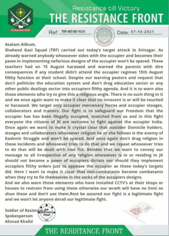 ഇന്ത്യന് സ്വതന്ത്ര്യദിന ചടങ്ങിനെ ‘വൃത്തികെട്ട ചടങ്ങ്’ എന്ന് വിളിച്ച പാകിസ്ഥാന് ഭീകര സംഘടന, അവരുടെ മുന്നറിയിപ്പും ഭീഷണിയും വകവയ്ക്കാതെ, ഈ അധ്യാപകര് സ്കൂളിലെ വിദ്യാര്ത്ഥിയെ പങ്കെടുപ്പിച്ചതിന്റെ ഗുരുതരമായ പ്രത്യാഘാതമാണ് അനുഭവിച്ചതെന്ന് . ഇന്ത്യന് ഭരണകൂടത്തിന്റെ ആജ്ഞയുടെ ഒരു ചട്ടുകമായി മാറുകയോ അല്ലെങ്കില് അവരുടെ കല്പ്പനകള് നടപ്പിലാക്കുകയോ ചെയ്താല് ആരും രക്ഷപ്പെടില്ലെന്ന് മുന്നറിയിപ്പ് നല്കി. കൊലപാതകങ്ങള്ക്ക് മതവുമായി യാതൊരു ബന്ധവുമില്ലെന്നും സ്വാതന്ത്ര്യം സംരക്ഷിക്കാനാണ് ആക്രമണമെന്നുമാണ് ഭീകരസംഘടന പറയുന്നത്. കടകളിലും വസതികളിലും സിസിടിവി ക്യാമറകള് സ്ഥാപിക്കുന്നതിനെതിരെയും ഭീകരര് ജനങ്ങള്ക്ക് മുന്നറിയിപ്പ് നല്കി.