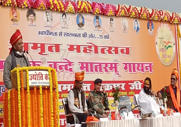 ആത്മാഭിമാനമുള്ള, പരമ വൈഭവ ശാലിയായ ഒരു രാഷ്ട്രത്തിന്റെ ദര്ശനം സാക്ഷാത്കരിക്കുക എന്നതാണ് അമൃത് മഹോത്സവത്തിന്റെ ലക്ഷ്യമെന്ന് പരിപാടിയില് സംസാരിച്ച ആര്എസ്എസ് സഹസര്കാര്യവാഹ് രാംദത്ത് ചക്രധര് പറഞ്ഞു. ഓര്ക്കുകയും വരും തലമുറയ്ക്ക് പരിചയപ്പെടുത്തുകയും ചെയ്യേണ്ട, അറിയപ്പെട്ടവരും അറിയപ്പെടാത്തവരുമായ നിരവധി സ്വാതന്ത്ര്യസമര സേനാനികള് ഉണ്ട്. വന്ദേമാതരം അവര്ക്കായുള്ള അര്ച്ചനയാണെന്ന് അദ്ദേഹം പറഞ്ഞു.