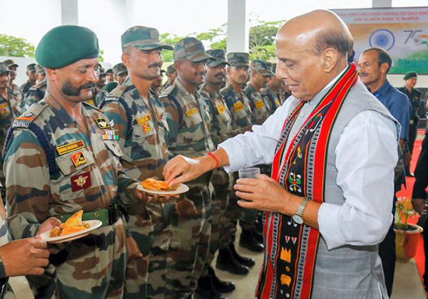 ഇംഫാലിലെ മന്ത്രിപുഖ്രിയില്‍ അസം റൈഫിള്‍സ് ഹെഡ്ക്വാര്‍ട്ടേഴ്സ് സന്ദര്‍ശിച്ച പ്രതിരോധ മന്ത്രി രാജ്നാഥ് സിങ് സൈനികര്‍ക്കൊപ്പം