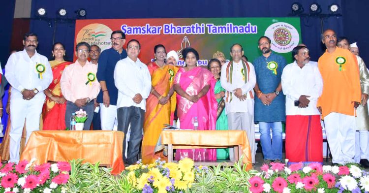 ആസാദി കാ അമൃത മഹോത്സവത്തിൻ്റെ ഭാഗമായി സംസ്കാർ ഭാരതി തമിഴ്നാട് ചെന്നൈയിൽ വെച്ച് സംഘടിപ്പിച്ച, ‘മൂവർണ്ണം’ പരിപാടി തെലുങ്കാന ഗവർണ്ണർ തമിഴിശൈ സൗന്ദരരാജൻ ഉദ്ഘാടനം ചെയ്തു.പത്മശ്രീ ഡോ പ്രിയദർശൻജി മുഖ്യാതിഥിയായി സംസ്ഥാന അധ്യക്ഷൻ നാരായണ ഭട്ട് ജി അധ്യക്ഷനായി. 72 കുട്ടികളെ അണിനിരത്തിക്കൊണ്ട് അത്ഭുതാവഹമായ നൃത്തമവതരിപ്പിച്ച പ്രസിദ്ധ കൊറിയോഗ്രാഫർ ദാക്ഷായണി രാമചന്ദ്രനെ ഗവർണ്ണർ ആദരിക്കുന്നു.