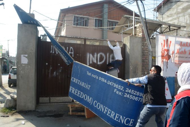 ശ്രീനഗറില്‍ ആള്‍പാര്‍ട്ടി ഹൂറിയത്ത് കോണ്‍ഫറന്‍സ് ആസ്ഥാനത്ത് ഉയര്‍ത്തിയിരുന്ന ബോര്‍ഡ് ജനങ്ങള്‍ നീക്കുന്നു
