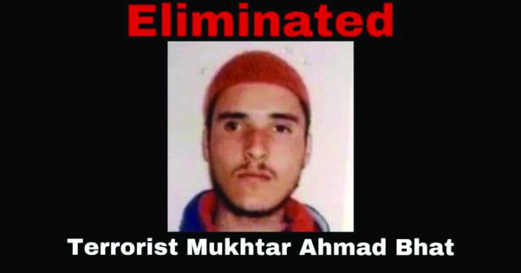 അവന്തിപ്പോര ഖണ്ഡിപ്പോര മേഖലയില് നടന്ന ഏറ്റുമുട്ടലിലാണ് മുഖ്തിയാര് ഭട്ട് അടക്കം മൂന്നുപേരെ വധിച്ചത്, സിആര്പിഎഫിലെ ഒരു എഎസ്ഐയെയും രണ്ട് സൈനികരെയും കൊലപ്പെടുത്തിയ സംഭവത്തില് പങ്കാളിയാണ് ഇയാളെന്ന് എഡിജിപി ട്വീറ്റ് ചെയ്തു. സുരക്ഷാസേനയുടെ ക്യാമ്പില് ചാവേര് ആക്രമണം ആസൂത്രണം ചെയ്യുന്നിതിനിടെയാണ് സൈനിക നടപടിയുണ്ടായത്. ഒരു എകെ 74 റൈഫിള്, ഒരു എകെ 56 റൈഫിള്, ഒരു പിസ്റ്റള് എന്നിവ ഇവരില് നിന്ന് കണ്ടെടുത്തു. കൊല്ലപ്പെട്ട മൂന്നാമന് റായീസ് അഹമ്മദാണ്.