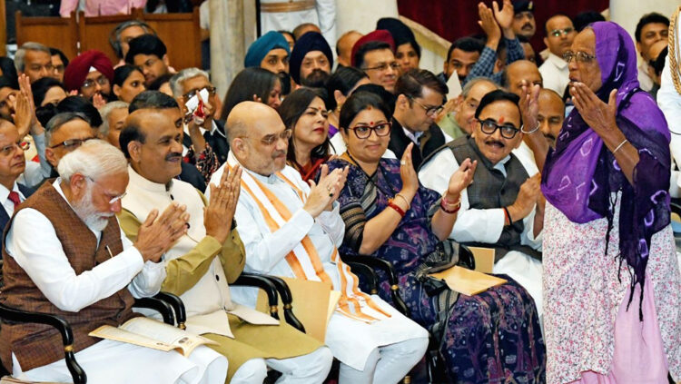 ഡൽഹി: രാഷ്‌ട്രപതി ഭവനിൽ നടന്ന പത്മ പുരസ്‌കാര ദാന ചടങ്ങിൽ നിന്നുള്ള മനോഹരമായ ഒരു വീഡിയോയാണ് സമൂഹമാദ്ധ്യമങ്ങളിൽ വൈറലാകുന്നത്. പത്മശ്രീ പുരസ്‌കാര ജേതാവായ ഹിർബായ് ഇബ്രാഹിം ലോബിയുടെ സന്തോഷ പ്രകടനമാണ് ഭാരതീയരുടെ ഹൃദയം കീഴടക്കുന്നത്. പുരസ്‌കാരം വാങ്ങുന്നതിനായി സദസ്സിലെത്തിയ ഹീർബായ് പ്രധാനമന്ത്രിയുടെ മുന്നിൽ വന്നു നിന്ന് സംസാരിക്കുന്നതിന്‍റെയും രാഷ്‌ട്രപതി ദ്രൗപദി മുർവിനെ തലോടുന്നതിന്‍റെയും വീഡിയോ ഭാരതീയർ ഏറ്റെടുത്ത് കഴിഞ്ഞു.