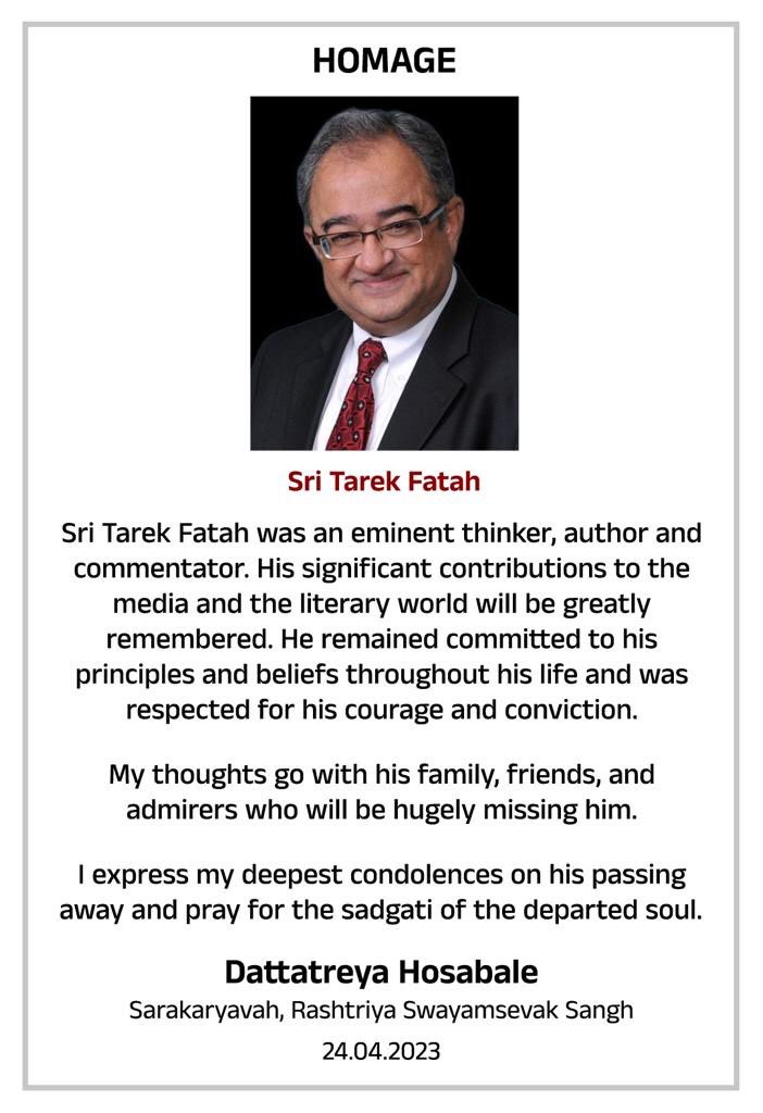 ന്യൂഡൽഹി: പ്രശസ്ത പാകിസ്താനി എഴുത്തുകാരൻ താരിക് ഫത്തായുടെ മരണത്തിൽ അനുശോചനം അറിയിച്ച് ആർഎസ്എസ് സർകാര്യവാഹ് ദത്താത്രേയ ഹൊസബാളെ.