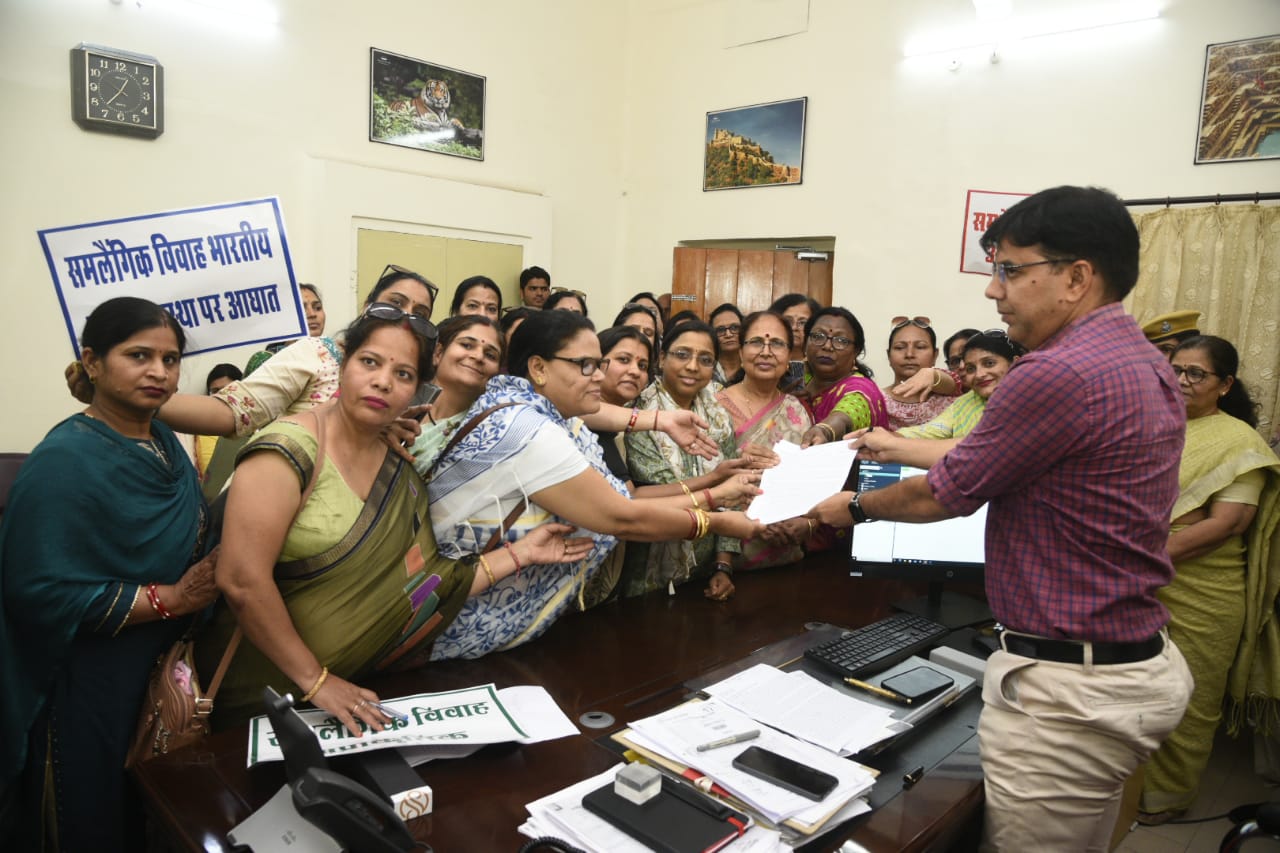 ജയ്പൂര്‍: സ്വവര്‍ഗ വിവാഹത്തിന് നിയമപരമായ അംഗീകാരം നല്‍കാനുള്ള നീക്കത്തിനെതിരെ രാഷ്ട്രപതിക്ക് നിവേദനവും പ്രതിഷേധവുമായി സ്ത്രീ സംഘടനകള്‍. രാഷ്ട്രപതിക്ക് നല്കാനുള്ള നിവേദനം ജയ്പൂര്‍ അഡീഷണല്‍ ജില്ലാ കളക്ടര്‍ക്ക് കൈമാറി. സ്വവര്‍ഗ വിവാഹം സംസ്‌കാരത്തിന് വിരുദ്ധമാണെന്നും അത് അംഗീകരിക്കരുതെന്നും സ്ത്രീ ബോധവത്കരണ സംഘം ആവശ്യപ്പെടുന്നു.