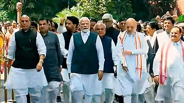 പ്രധാനമന്ത്രി നരേന്ദ്രമോദിയോടൊപ്പം ആഭ്യന്തരമന്ത്രി അമിത് ഷാ, പ്രതിരോധമന്ത്രി രാജ്നാഥ് സിംഗ്, മറ്റ് കേന്ദ്രമന്ത്രിമാർ എന്നിവരോടൊപ്പം എല്ലാ എംപിമാരും അനുഗമിച്ചിരുന്നു. പഴയ പാർലമെന്റ് മന്ദിരമെന്നല്ല, ഇനി മുതൽ ‘സംവിധാൻ സദൻ’ എന്നാണ് അറിയപ്പെടേണ്ടതെന്ന് പ്രഖ്യാപിച്ചായിരുന്നു പ്രധാനമന്ത്രി പഴയ മന്ദിരത്തിന്റെ പടിയിറങ്ങിയത്.