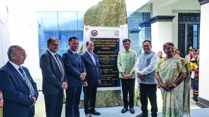 കൊഹിമയില്‍ നാഗാലാന്‍ഡ് ഇന്‍സ്റ്റിറ്റ്യൂട്ട് ഓഫ് മെഡിക്കല്‍ സയന്‍സസ് ആന്‍ഡ് റിസര്‍ച്ച് ഉദ്ഘാടനത്തിന് ശേഷം കേന്ദ്രമന്ത്രി മന്‍സുഖ് മാണ്ഡവ്യയും നാഗാ മുഖ്യമന്ത്രി നെയ്ഫിയു റിയോയും മുതിര്‍ന്ന ഉദ്യോഗസ്ഥരും