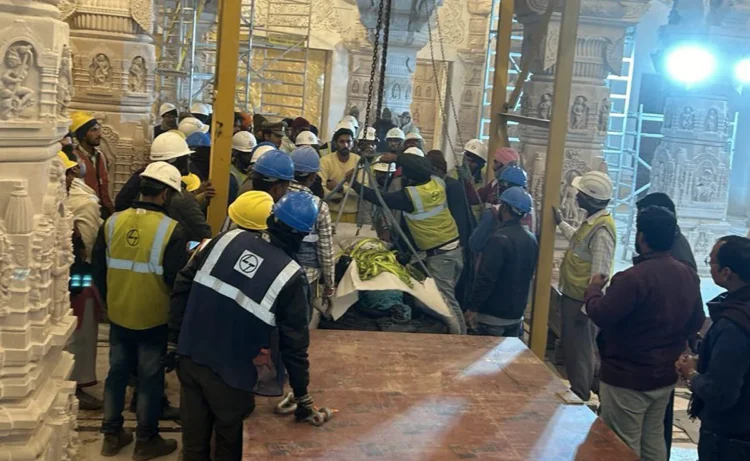 പ്രാണ പ്രതിഷ്ഠയ്ക്ക് മുന്നോടിയായി രാംലല്ലയുടെ വിഗ്രഹം ശ്രീകോവിലിൽ എത്തിച്ചു.’ജയ് ശ്രീറാം’ വിളികളുടെ അകമ്പടിയോടെയായിരുന്നു വിഗ്രഹം ഗർഭഗൃഹത്തിലേക്ക് ആനയിച്ചത്.