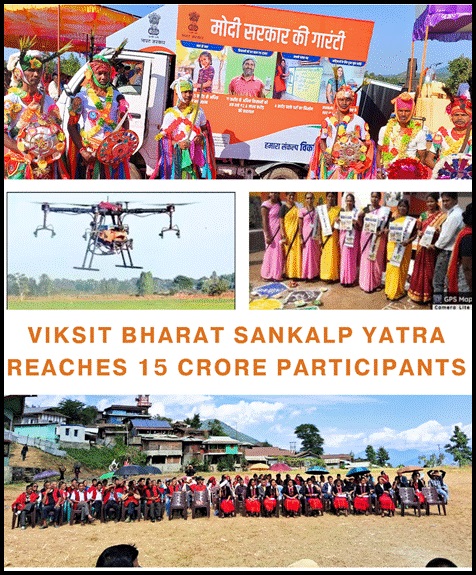 രാജ്യത്തുടനീളമുള്ള സര്‍ക്കാര്‍ പദ്ധതികളുടെ 100% നടപ്പാക്കല്‍ ഉറപ്പിക്കാന്‍ ലക്ഷ്യമിട്ടുള്ള സുപ്രധാന സംരംഭമാണ് ‘വികസിത് ഭാരത് സങ്കല്‍പ്പ് യാത്ര’. രാജസ്ഥാന്‍, മധ്യപ്രദേശ്, ഛത്തീസ്ഗഢ്, തെലങ്കാന എന്നീ സംസ്ഥാനങ്ങളില്‍ പ്രചാരണം ആരംഭിച്ചശേഷം ജനങ്ങളുടെ പങ്കാളിത്തത്തില്‍ ഗണ്യമായ വര്‍ധനവാണുണ്ടായതെന്ന് സര്‍ക്കാര്‍ വ്യക്തമാക്കി.