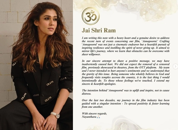 ജയ് ശ്രീറാം വിളിച്ച് മാപ്പ് പറഞ്ഞ് നയൻതാര, ഞാൻ ദൈവ വിശ്വാസി ;‘അന്നപൂരണി’ വിവാദത്തിൽ വിശദീകരണം