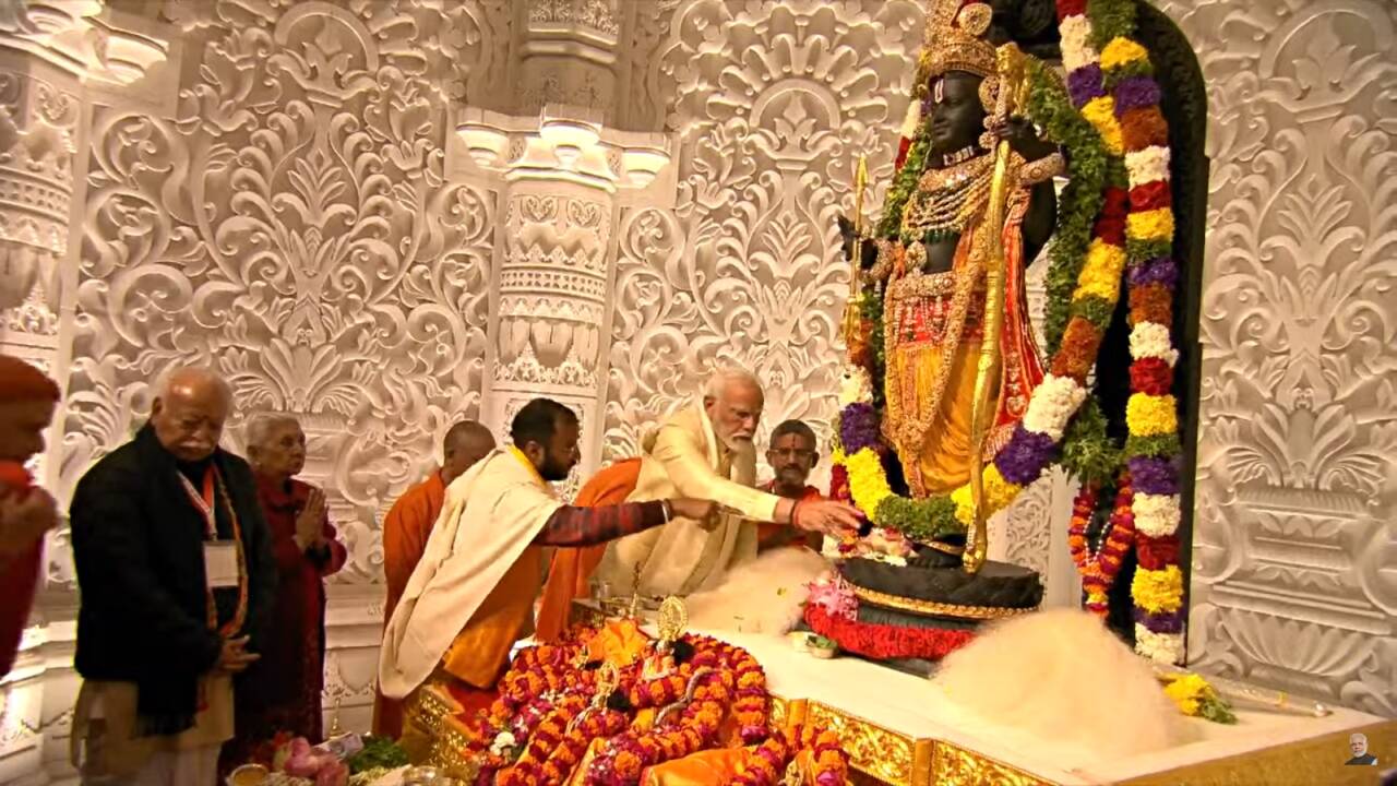 12:29:8 മുതല് 12:30: 32 നാഴിക വരെയുള്ള പവിത്രമായ അഭിജിത്ത് മുഹൂര്ത്തത്തിലായിരുന്നു പ്രാണ പ്രതിഷ്ഠ. 84 സെക്കന്ഡ് നേരത്തോളം ചടങ്ങ് നീണ്ടു. രാം ലല്ലയുടെ വിഗ്രഹത്തിന്റെ കണ്ണുകള് തുറന്ന് അഞ്ജനമെഴുതി. കണ്ണാടി ഉപയോഗിച്ച് ഭഗവാന് തന്നെ ആദ്യം ഭഗവാനെ കണ്ട ഈ ധന്യമുഹൂര്ത്തത്തില് ഇന്ത്യന് സൈന്യത്തിന്റെ ഹെലികോപ്റ്ററുകള് അയോദ്ധ്യയുടെ മണ്ണിലേക്ക് പുഷ്പവൃഷ്ടി നടത്തി.