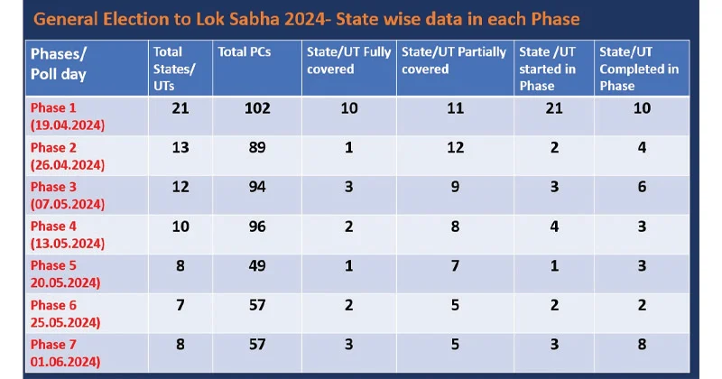 കേരളത്തിൽ ഒറ്റഘട്ടമായാണ് തിരഞ്ഞെടുപ്പ് നടക്കുക. ആദ്യഘട്ട വോട്ടെടുപ്പ് ഏപ്രിൽ 19ന് നടക്കും. ലോക്സഭാ തെരഞ്ഞെടുപ്പിനൊപ്പം നാലു സംസ്ഥാന നിയമസഭകളിലേയ്ക്കും ലോക്സഭാ തെരഞ്ഞെടുപ്പിനൊപ്പം വോട്ടെടുപ്പ് നടക്കും. 26 നിയമസഭാ സീറ്റുകളിലേയ്ക്ക് ഉപതെരഞ്ഞെടുപ്പും നടക്കും. ആന്ധ്രാപ്രദേശ്, സിക്കിം, അരുണാചല്പ്രദേശ്, ഒഡീഷ എന്നി സംസ്ഥാന നിയമസഭകളിലേയ്ക്കാണ് തെരഞ്ഞെടുപ്പ് പ്രഖ്യാപിച്ചത്. ആന്ധ്രാപ്രദേശിൽ മെയ് 13നാണ് നിയസഭാ തെരഞ്ഞെടുപ്പ്. ഒഡീഷയിൽ രണ്ട് ഘട്ടങ്ങളിലായി നിയമസഭാ തെരഞ്ഞെടുപ്പ് നടക്കും.