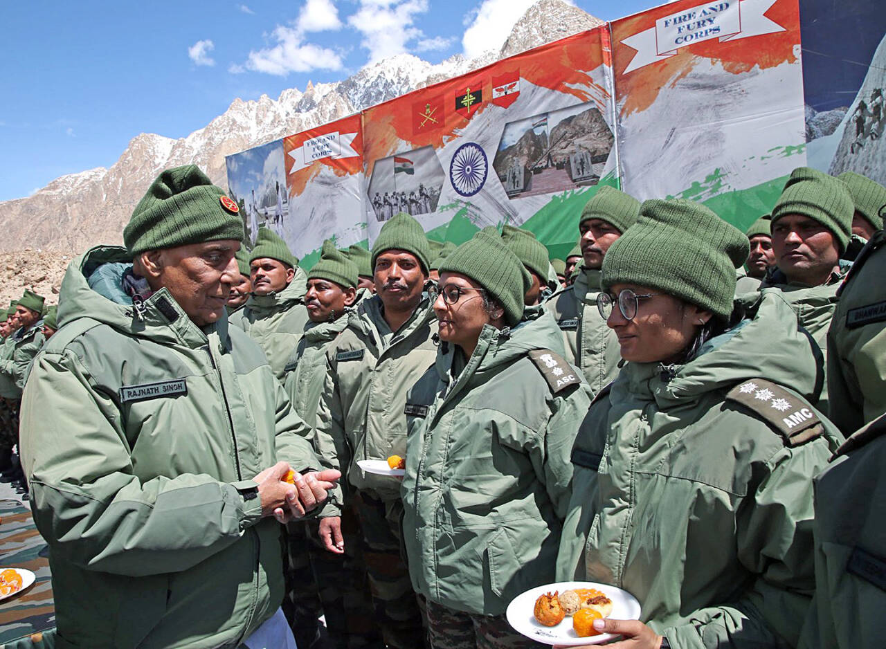 സിയാച്ചിന് ഹിമാനിയിലെ കുമാര് പോസ്റ്റില് വിന്യസിച്ചിരിക്കുന്ന സായുധസേനാ ഉദ്യോഗസ്ഥരുമായി സംവദിച്ച അദ്ദേഹം രാജ്നാഥ് സിങ് അവര്ക്ക് മധുരം വിതരണം ചെയ്തു. ലോകത്തിലെ ഏറ്റവും ഉയരം കൂടിയ യുദ്ധഭൂമിയില് നിലയുറപ്പിച്ച് രാജ്യത്തെ സംരക്ഷിക്കുന്നതിന് ഓരോ സൈനികരെയും അഭിനന്ദിക്കുന്നുവെന്ന് അദ്ദേഹം പറഞ്ഞു. സിയാച്ചിന് ഒരു സാധാരണ ഭൂമിയല്ല, രാജ്യത്തിന്റെ പരമാധികാരത്തിന്റെയും സ്ഥിരോത്സാഹത്തിന്റെയും പ്രതീകമാണ്. നമ്മുടെ ദേശീയ നിശ്ചയദാര്ഢ്യത്തെ പ്രതിനിധീകരിക്കുന്ന ഇടമാണ്, രാജ്നാഥ് സിങ് പറഞ്ഞു.