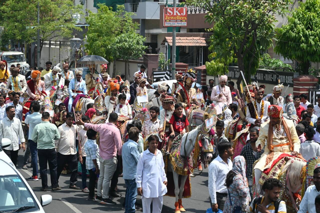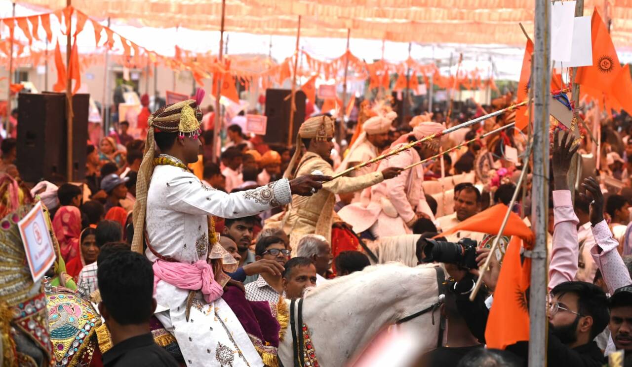 ലളിതമായിരുന്നു ചടങ്ങുകള്. വിദാധര് നഗറിലെ അഗര്വാള് കാറ്റേഴ്സില് നിന്ന് 45 കുതിരകളിലായെത്തിയ വരന്മാരെ പുഷ്പാര്ച്ചനയോടെയാണ് വിവാഹ വേദിയിലേക്ക് ആനയിച്ചത്. ഒരു പന്തല്. നാല്പത്തഞ്ച് കല്യാണമണ്ഡപങ്ങള്. അനുഗ്രഹങ്ങള് ചൊരിഞ്ഞ് വിവിധ സംന്യാസിമഠങ്ങളിലെ ആചാര്യന്മാര്…. ശ്രീരാമസീതാ വിവാഹം നടന്ന ജാനകി നവമി നിമിത്തമാക്കിയാണ് സേവാഭാരതി ചടങ്ങുകള് ഒരുക്കിയത്. ശ്രീരാമന്റെ ജീവിതത്തില് നിന്ന് പ്രേരണ ഉള്ക്കൊണ്ട് ഉത്തമ ഹിന്ദു കുടുംബം നയിക്കുമെന്ന് വധൂവരന്മാര് പ്രതിജ്ഞ ചെയ്തു.