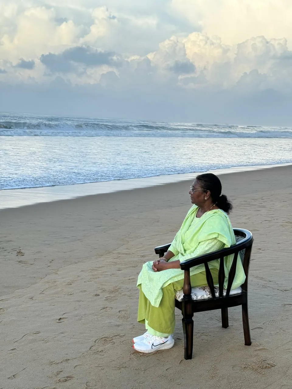 കടല്‍പ്പുറത്ത് ചെലവഴിക്കുന്ന ചിത്രങ്ങള്‍ പങ്കുവച്ച രാഷ്ട്രപതി പ്രകൃതിയുടെ സംരക്ഷണത്തെക്കുറിച്ചുള്ള ചിന്തകളാണ് എക്‌സില്‍ കുറിച്ചത്. പര്‍വതങ്ങള്‍, നദികള്‍, കാടുകള്‍, കടല്‍ത്തീരങ്ങള്‍ തുടങ്ങിയ നമ്മളും പ്രകൃതിയുടെ ഭാഗമാണെന്ന് ഓര്‍മ്മിപ്പിക്കുന്നു, കടല്‍ത്തീരത്തുകൂടി നടക്കുമ്പോള്‍ ഈ പ്രകൃതിയുമായുള്ള ബന്ധം ആഴത്തില്‍ അനുഭവപ്പെടുന്നു. ഇതൊരു ധ്യാനാനുഭവമാണ്.