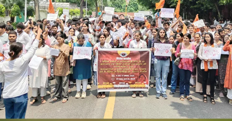 ദല്ഹിയിലെ ബംഗാ ഭവനിലേക്ക് നടത്തിയ മാര്ച്ച് എബിവിപി ദേശീയ ജനറല് സെക്രട്ടറി യാജ്ഞവല്ക്യ ശുക്ല ഉദ്ഘാടനം ചെയ്തു. ആര്ജി കര് മെഡിക്കല് കോളജിലുണ്ടായ സംഭവം ഹൃദയഭേദകമാണ്. സ്ത്രീകള്ക്ക് അവരുടെ ജോലിസ്ഥലത്തുപോലും സുരക്ഷ ഉറപ്പാക്കാന് മമത സര്ക്കാരിന് ആവുന്നില്ലെന്ന് അദ്ദേഹം കുറ്റപ്പെടുത്തി.