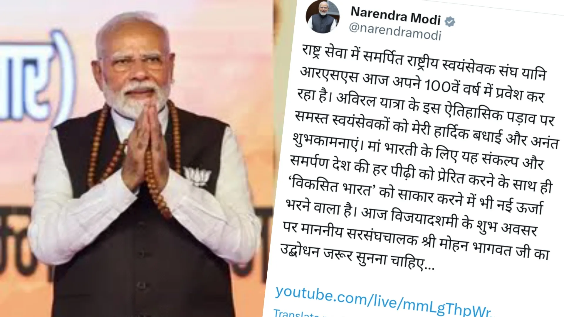 ന്യൂഡൽഹി : 100 വർഷം പൂർത്തിയാക്കുന്ന ആർ എസ് എസിന് ആശംസകളുമായി പ്രധാനമന്ത്രി നരേന്ദ്രമോദി. ദേശീയ സേവനത്തിനായി സമർപ്പിച്ച രാഷ്ട്രീയ സ്വയംസേവക സംഘം ഈ വിജയദശമി ദിനത്തിലാണ് 100 വർഷം പൂർത്തിയാക്കിയത്. ഈ ചരിത്ര നാഴികക്കല്ല് കൈവരിച്ച എല്ലാ സന്നദ്ധ പ്രവർത്തകർക്കും ഹൃദയം നിറഞ്ഞ അഭിനന്ദനങ്ങളും ആശംസകളും. രാജ്യത്തോടുള്ള നിങ്ങളുടെ നിശ്ചയദാർഢ്യവും സമർപ്പണവും ഓരോ തലമുറയ്ക്കും പ്രചോദനമാണ്. വികസിത ഇന്ത്യ കൈവരിക്കുന്നതിന് അത് പുതിയ ഊർജം പകരും. ‘ എന്നും പ്രധാനമന്ത്രി ട്വിറ്ററിൽ കുറിച്ചു.