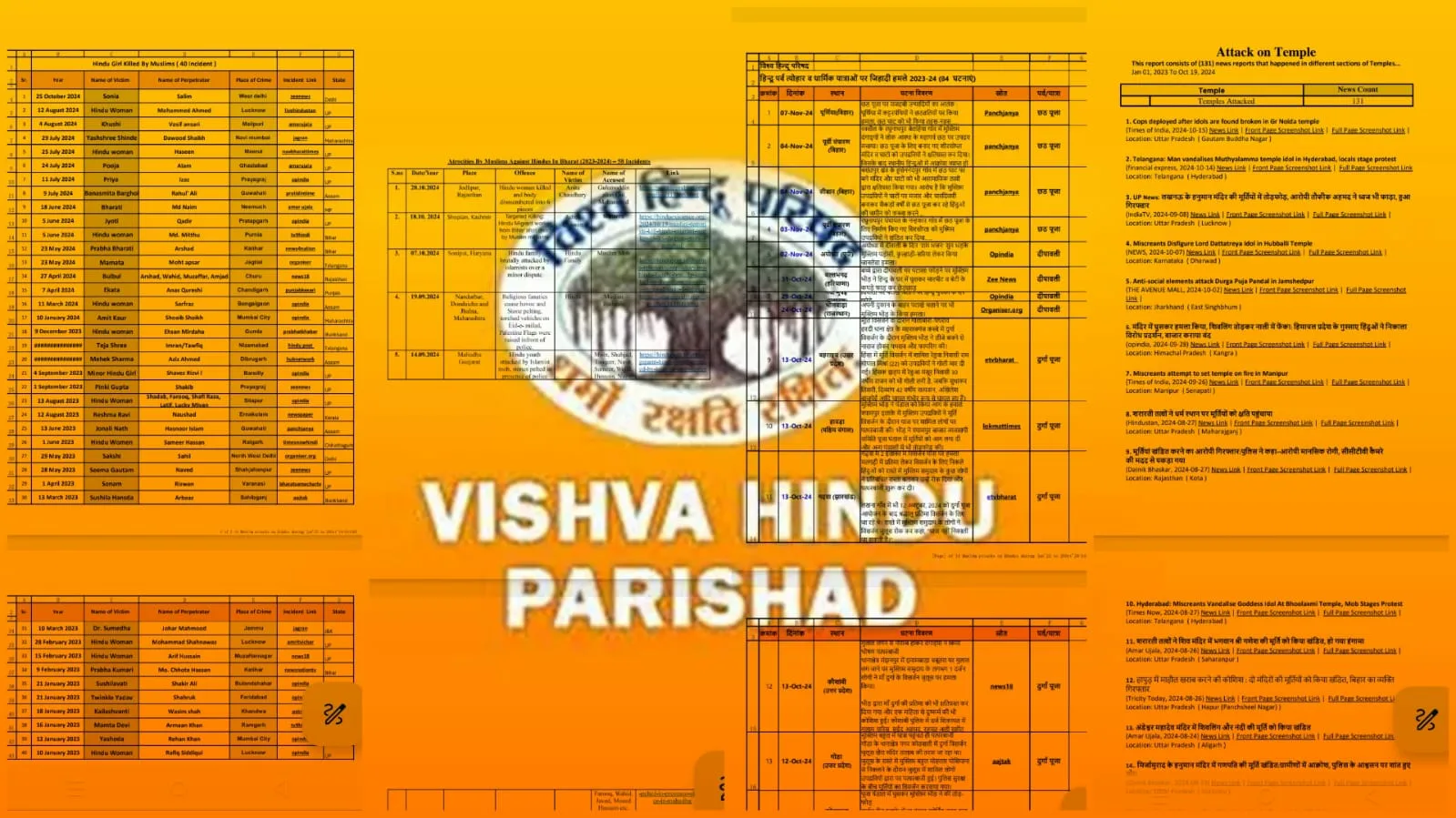 2023 ജനുവരി മുതല് ഈ വര്ഷത്തെ ഛാഠ് പൂജ വരെയുള്ള കാലയളവില് നടന്ന ആക്രമണങ്ങളുടെ പട്ടിക മാത്രം മുന്നൂറിലേറെയാണ്. 131 ക്ഷേത്രങ്ങളാണ് ഈ കാലയളവില് ആക്രമിക്കപ്പെട്ടത്. നാല്പത് ഹിന്ദു പെണ്കുട്ടികളുടെ കൊലപാതകമാണ് ഈ അക്രമസംഭവങ്ങളില് റിപ്പോര്ട്ട് ചെയ്തിട്ടുള്ളത്. ഉത്സവങ്ങള്ക്കും തീര്ഥാടനങ്ങള്ക്കും നേരെയുള്ള ആക്രമണങ്ങളുടെ എണ്ണം 84 ആണ്. 58 കേസുകള് ഭക്തര്ക്കും ഹിന്ദുസംഘടനാപ്രവര്ത്തകര്ക്കും നേരെയുള്ള ആക്രമണങ്ങളാണ്. യഥാര്ത്ഥത്തില് അരങ്ങേറിയ അതിക്രമങ്ങളുടെ പത്തിലൊന്ന് മാത്രമേ പട്ടികയില് ഉള്പ്പെടുത്താന് ആയിട്ടുള്ളൂ. മാധ്യമ വാര്ത്തകളെ മാത്രം അടിസ്ഥാനമാക്കിയുള്ള കണക്കെടുപ്പാണിത്. റിപ്പോര്ട്ട് ചെയ്യാത്ത സമാനമായ സംഭവങ്ങള് നിരവധിയാണ്.
