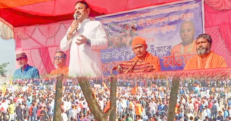 സനാതനി ഒക്യോമഞ്ച് സംഘടിപ്പിച്ച പ്രതിഷേധ മഹാറാലി ബംഗ്ലാദേശിലെ ഹിന്ദുക്കളുടെ ജീവനും സ്വത്തും സംരക്ഷിക്കാന് നടപടി സ്വീകരിച്ചില്ലെങ്കില് കനത്ത പ്രത്യാഘാതം നേരിടേണ്ടിവരുമെന്ന് മുന്നറിയിപ്പ് നല്കി. നീതിക്കും ആരാധനാ സ്വാതന്ത്ര്യത്തിനു വേണ്ടിയുള്ള പോരാട്ടത്തിനാണ് കരിംഗഞ്ചില് തുടക്കം കുറിക്കുന്നതെന്ന് റാലി ഉദ്ഘാടനം ചെയ്ത സില്ച്ചാര് ശങ്കരമഠാധിപതി അഷിത് ചക്രവര്ത്തി പറഞ്ഞു.