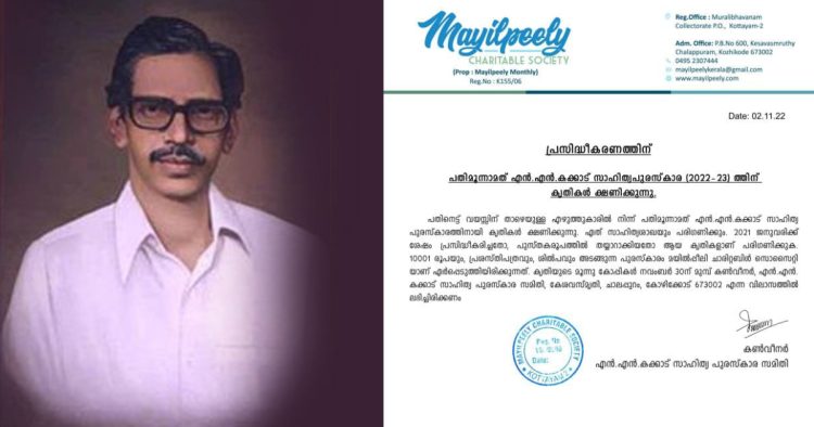 കോഴിക്കോട്: പതിനെട്ട് വയസ്സിന് താഴെയുള്ള എഴുത്തുകാരിൽ നിന്ന് പതിമൂന്നാമത് എൻ.എൻ. കക്കാട് സാഹിത്യ പുരസ്കാരത്തിനായി കൃതികൾ ക്ഷണിക്കുന്നു. ഏത് സാഹിത്യശാഖയും പരിഗണിക്കും. 2021 ജനുവരിക്ക് ശേഷം പ്രസിദ്ധീകരിച്ചതോ, പുസ്തകരൂപത്തിൽ തയ്യാറാക്കിയതോ ആയ കൃതികളാണ് പരിഗണിക്കുക. 10001 രൂപയും, പ്രശസ്തിപത്രവും, ശിൽപവും അടങ്ങുന്ന പുരസ്കാരം മയിൽപ്പീലി ചാരിറ്റബിൾ സൊസൈറ്റിയാണ് ഏർപ്പെടുത്തിയിരിക്കുന്നത്. കൃതിയുടെ മൂന്നു കോപ്പികൾ നവംബർ 30ന് മുമ്പ് കൺവീനർ, എൻ.എൻ.കക്കാട് സാഹിത്യ പുരസ്കാര സമിതി, കേശവസ്മൃതി, ചാലപ്പുറം, കോഴിക്കോട് 673002, എന്ന വിലാസത്തിൽ ലഭിച്ചിരിക്കണം.