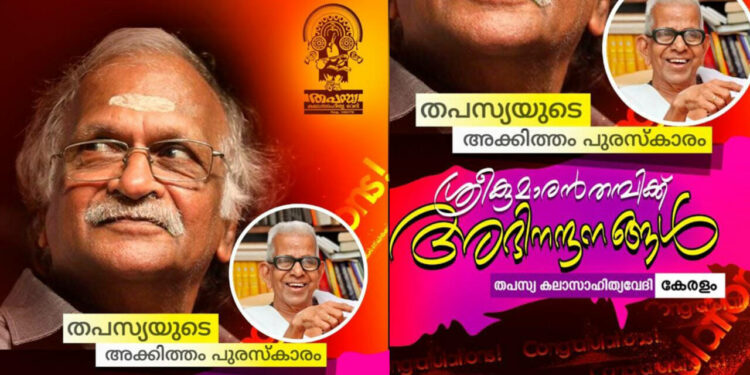 തിരുവനന്തപുരം: തപസ്യ കലാസാഹിത്യവേദിയുടെ ഈ വര്ഷത്തെ അക്കിത്തം പുരസ്കാരം ശ്രീകുമാരന് തമ്പിക്ക്. ഒരു ലക്ഷം രൂപയും പ്രശസ്തിഫലകവും അടങ്ങുന്നതാണ് പുരസ്കാരം. തിരുവനന്തപുരത്ത് വൈലോപ്പിള്ളി സംസ്കൃതിഭവനില് ഡിസംബര് 18ന് സംഘടിപ്പിക്കുന്ന മഹാകവി അക്കിത്തം അനുസ്മരണ പരിപാടിയില് പുരസ്കാരം സമ്മാനിക്കുമെന്ന് തപസ്യ സംസ്ഥാന അധ്യക്ഷന് പ്രൊഫ. പി.ജി. ഹരിദാസ് വാര്ത്താസമ്മേളനത്തില് അറിയിച്ചു.