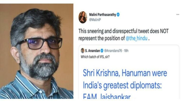 ഏത് ബാച്ച് ഐ,എഫ്.എസ് ആണെന്ന പരിഹാസ ചോദ്യമായിരുന്നു ആനന്ദൻ ട്വീറ്റ് ചെയ്തത്. ശ്രീകൃഷ്ണനും ഹനുമാനും ഏത് ബാച്ചിലെ ഐ.എഫ്. എസുകാരാണെന്ന ചോദ്യമായിരുന്നു പരിഹാസരൂപേണ ഉന്നയിച്ചത്. ഇതിനെതിരെ ശക്തമായ മറുപടികൾ ട്വിറ്ററിൽ ഉണ്ടായി. തുടർന്നാണ് മാലിനി പാർത്ഥസാരഥി വിശദീകരണവുമായെത്തിയത്. ഇതോടെ ആനന്ദൻ ട്വീറ്റ് ഡിലീറ്റ് ചെയ്തു.