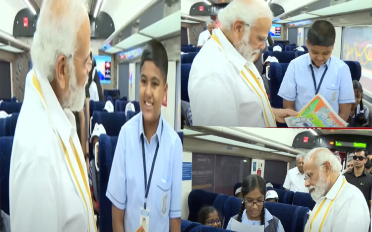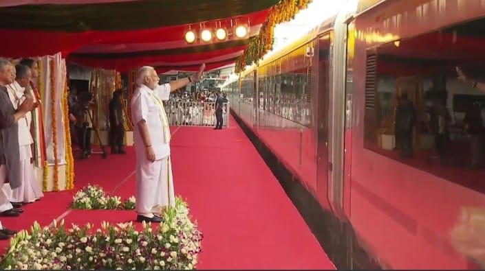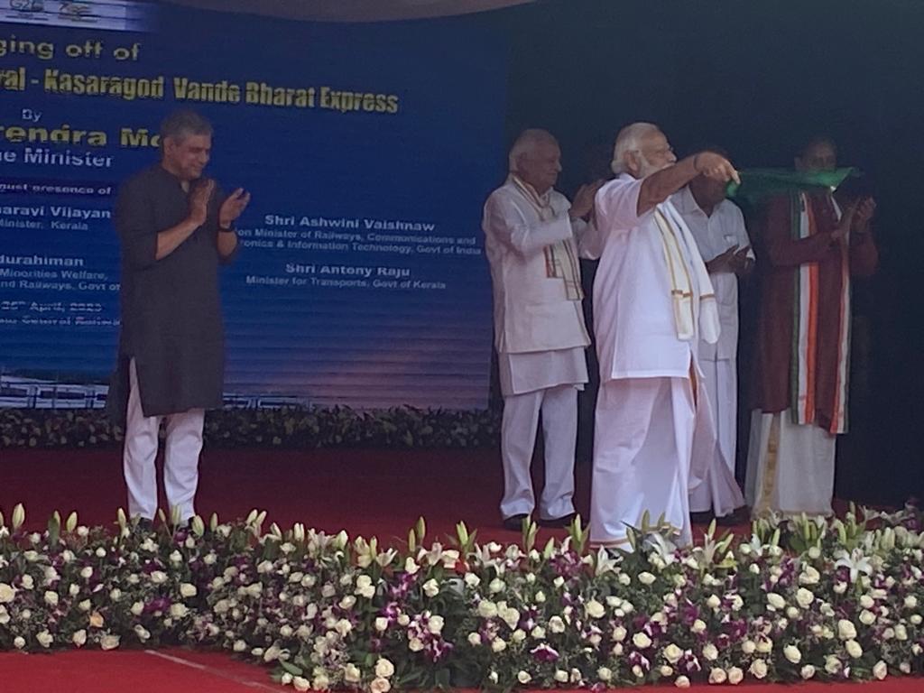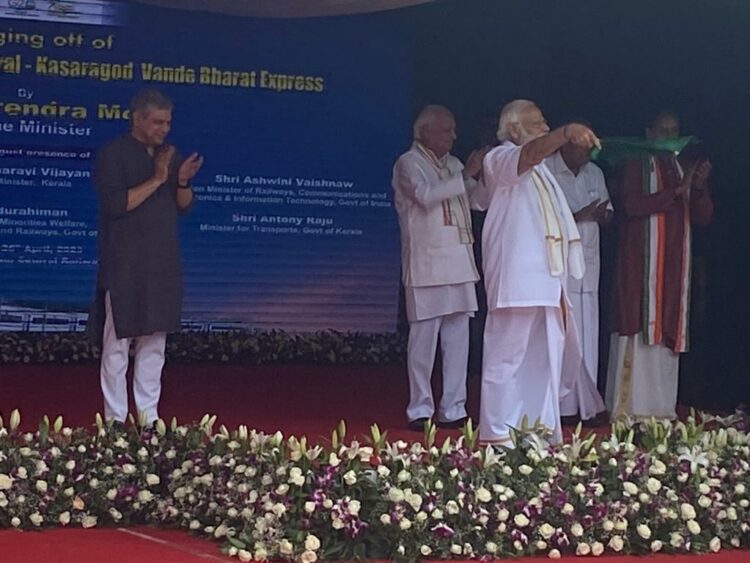 തിരുവനന്തപുരം: കേരളത്തിന് ഇത് അഭിമാന നിമിഷം, വന്ദേ ഭാരതിന് പച്ചക്കൊടി വീശി പ്രധാനമന്ത്രി നരേന്ദ്രമോദി. 11.10-നാണ് സെൻട്രൽ റെയിൽവേ സ്‌റ്റേഷനിൽ വന്ദേ ഭാരതിന്റെ ഫ്‌ളാഗ് ഓഫ് നടന്നത്. ഫ്‌ളാഗ് ഓഫിന് മുൻപ് വിവിധ രംഗത്ത് കഴിവ് തെളിയിച്ച വിദ്യാർത്ഥികളുമായും നരേന്ദ്രമോദി സംവദിച്ചു. കൊല്ലം, എറണാകുളം, തിരുവനന്തപുരം എന്നീ ജില്ലകളിലെ വിവിധ സ്‌കൂളുകളിൽ നടത്തിയ ഉപന്യാസ, കവിതാ,ചിത്രരചന മത്സരങ്ങൾ നടത്തിയിരുന്നു. ഇതിൽ വിജയികളായ വിദ്യാർത്ഥികളും ആദ്യ യാത്രയിലുണ്ടായിരുന്നു.
